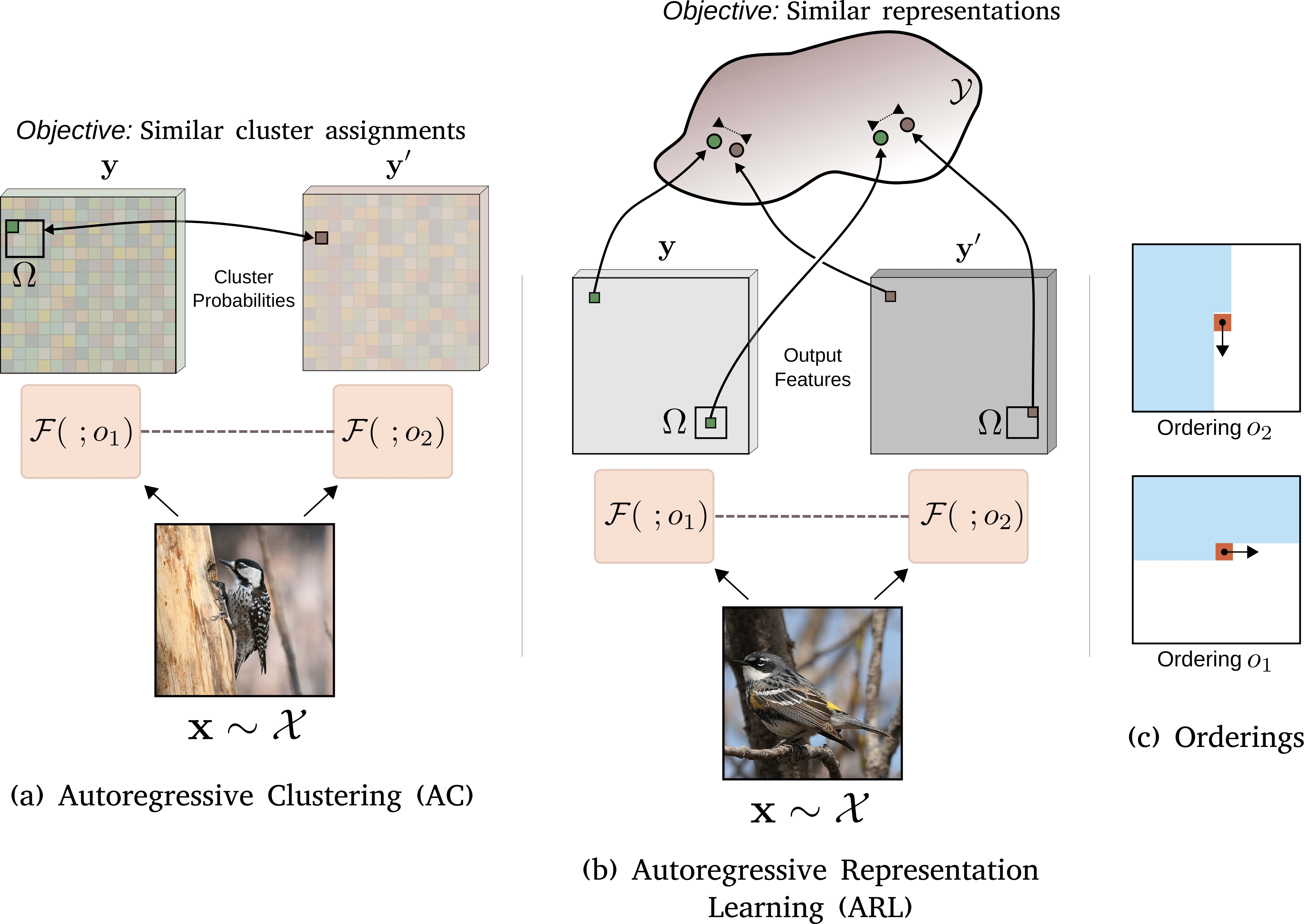Figure: Overview. Given an encoder-decoder type network \(\mathcal{F}\) and two valid orderings (\(o_1\) , \(o_2\) ) as illustrated in (c). The goal is to maximize the Mutual Information (MI) between the two outputs over the different views, i.e. different orderings. (a) For Autoregressive Clusterings (AC), we output the cluster assignments in the form of a probability distribution over pixels, and the goal is to have similar assignments regardless of the applied ordering. (b) For Autoregressive Representation Learning (ARL), the objective is to have similar representations at each corresponding spatial location and its neighbors over a window of small displacements \(\Omega\).